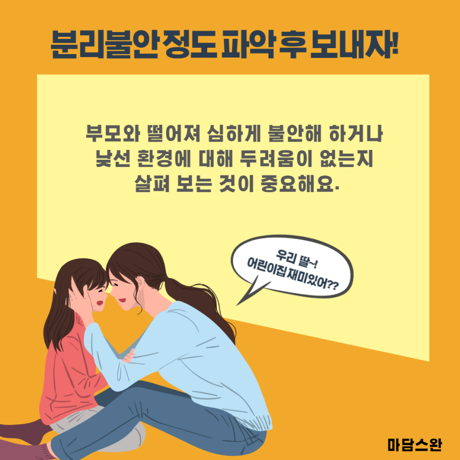 어린이집을 보내기 전 가장 먼저 살펴야 하는 부분은 분리불안 정도예요.