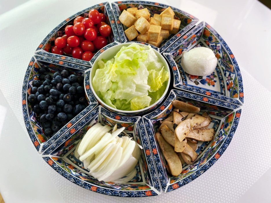 오늘의 샐러드 재료는 블루베리, 방울토마토, 양상추, 양파, 부라타치즈, 두부, 버섯으로
