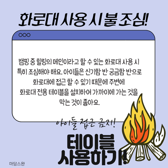 주변에 화로대 전용 테이블을 설치하여 가까이에 가는 것을 막는 것이 좋아요.