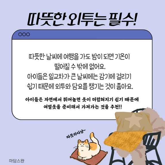 따뜻한 날씨에 여행을 가도 밤이 되면 기온이 떨어질 수밖에 없어요.