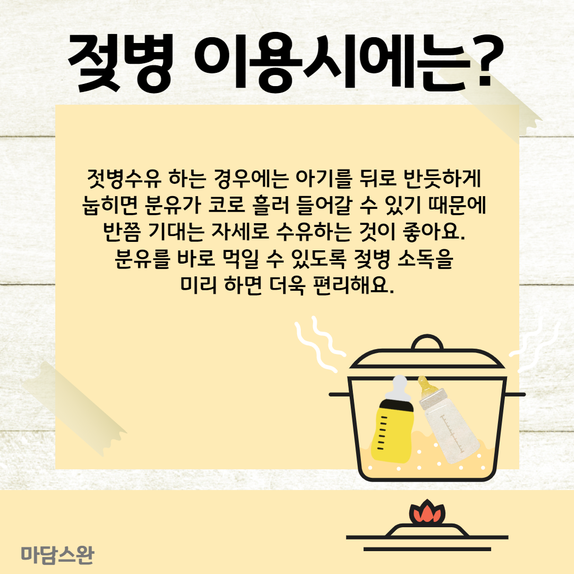 젖병수유 하는 경우에는 아기를 뒤로 반듯하게 눕히면 분유가 코로 흘러
