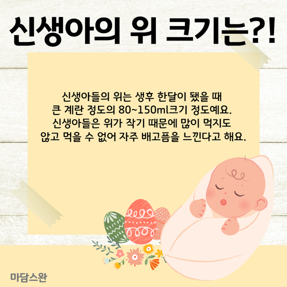 신생아들의 위는 생후 한 달이 됐을 때 큰 계란 정도의 80~150ml 크기 정도예요.