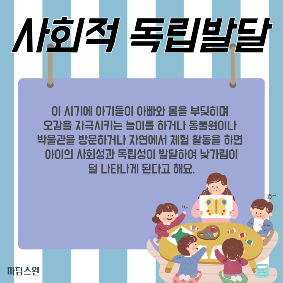 아이의 사회성과 독립성이 발달하여 낯가림이 덜 나타나게 된다고 해요.